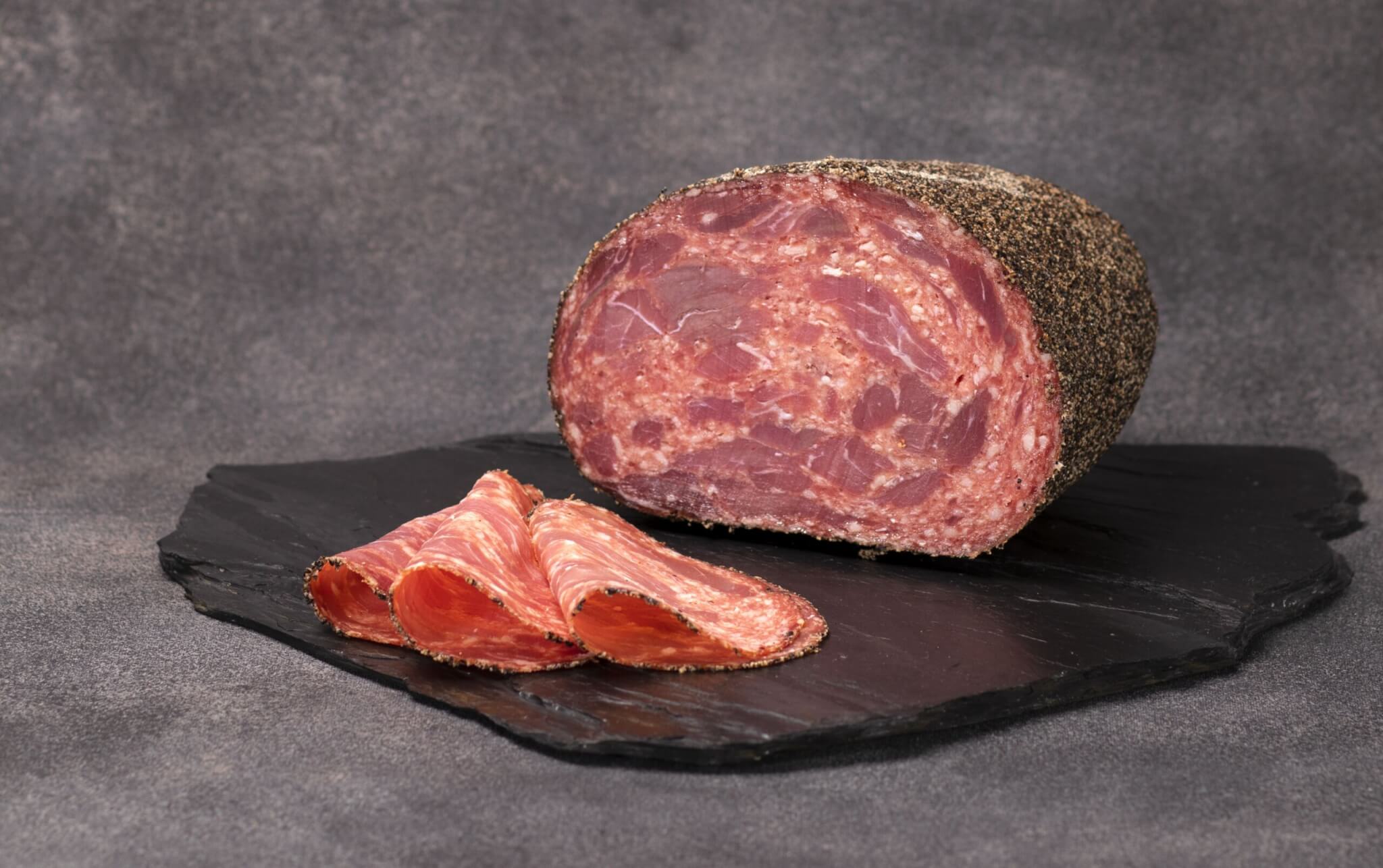 Producido en Cataluña, la región famosa por sus embutidos, este salami se destaca por los trozos de jamón que se encuentran adentro. El calibre de este producto es más grande que del salami tradicional, que le da una forma original a sus tablas de quesos y carnes curadas.